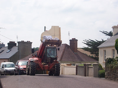 Warum dieses Foto? Ganz einfach: Weil es so treffend ausdrückt, dass auf der Insel doch andere Gesetze herrschen als in Mitteleuropa, dass die Uneindeutigkeit, die Ambivalenz und das Widersprüchliche hier in hohen Ehren gehalten werden – neben der Schlamperei, der Viertelfinalsmentalität, der Perfektionierung des Unperfekten und dem schrägen Humor. Wilfried Mähr schickte uns übrigens fast dasselbe Motiv, allerdings aufgenommen an einer Kreuzung, was das Foto nicht ganz so eindeutig wirken ließ. Trotzdem: Vielen Dank! Auf Platz zwei kam der Konzert-Flügel, der in Bantry, West Cork, auf unkonventionelle Weise mit einem schweren Baustellenfahrzeug umgezogen wird (Foto unten). Danke dafür, liebe Claudia. Ein Dank an alle, die mitgemacht haben.