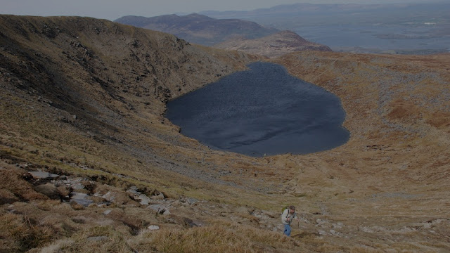 Irische Ortsnamen erinnern auch an die Beklemmungen, unter denen phantasie-geplagte Inselbewohner früher gelitten haben müssen: The Hag´s Glen (Das Tal der Hexe), The Hag´s Tooth (der Zahn derselben), Tighe na Sidhe (das Feen-Haus), The Devil´s Elbow (Ellbogen des Teufels) oder The Devil´s Punch Bowl (Foto unten, die Bowle-Schüssel des Leibhaftigen) sind bekannte Orte im ländlichen Irland. Die irische Landschaft mit ihren vielfältigen bizarren Formen regt bis heute die Phantasie des Menschen an, um in Bäumen und Felsen verborgene Wesen zu entdecken. Der Steinkopf (Foto oben), mit kurzer, auf die Schädelplatte reduzierter Kampffrisur, blickt vom Hügel herunter auf die andere Seite. Was er wohl sieht? Was wir wohl sehen?