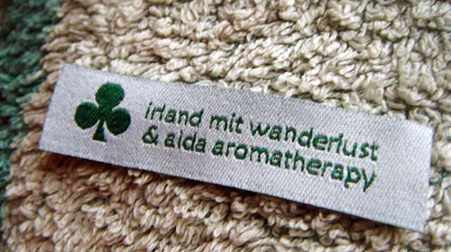 Wenn man keine Arbeit hat macht man sich welche… Ich habe bei Namensbänder endlich mal Etiketten machen lassen – statt für meine kaum noch stattfindenden Einfach-so-Handarbeiten nun für alles Textile in unserem demnächst zu beziehenden Gästehaus. Nur noch vier Wochen für viele, viele Dinge, die vorzubereiten sind. Jedenfalls werde ich nun diese guten Stücke an alle Handtücher und an die Bettwäsche nähen, da wir einen Wäschedienst für diese Arbeit beauftragen werden (die Bügeletiketten haben mir nicht so gut gefallen). Da mein Mann und ich anders lautende Firmennamen haben und wir im Gästehaus unserer beide Gäste unterbringen werden, haben wir sozusagen Kombi-Etiketten entworfen (er bietet Wanderwochen an und ich Aromatherapie-Kurse). Das Kleeblatt ist das offizielle Symbol für Irland, zum Glück war es unter den unzähligen Symbolen der Bänderfirma. Für Handarbeiten haben sie auch wunderschöne Symbole, für kürzere Namen würde ich einen Rahmen wählen, den sie auch anbieten. Man kann viele unterschiedliche Bandfarben wählen und ebenso viele Schriftfarben und auch viele unterschiedliche Schriften. Das alles kann man online „basteln“ und erst abschicken, wenn es einem gefällt. Ein witziges Spielzeug, das ich schon oft ausprobiert habe, ohne zu bestellen.