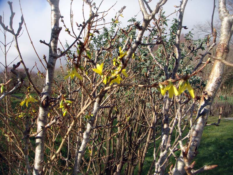 Tatsächlich, die ersten Forsythien blühen! Ich habe also nicht übertrieben, als ich vor einigen Tagen sagte, es sei hier wie im April. Ich habe bis 18.45 gejätet, gar nicht so einfach, weil schon so viele Pflänzchen draußen sind, unter anderem meine geliebten wuchernden Akeleien, die dürfen nicht gerupft werden. | Yes, the first forsythias are in bloom. I can’t believe it, the weather feels like in April. I weeded until 6:45 pm. Not so easy as many plants are already quite grown. Including my lovely dozens of columbines which I try to keep.