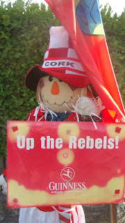 Fotos: Szene aus dem Juniors-Spiel Cork gegen Galway (Foto: GAA); Puppen in den Farben des County Cork am Straßenrand (Fotos:mab)