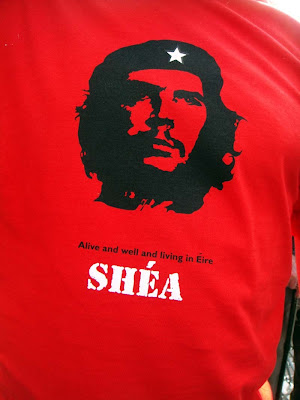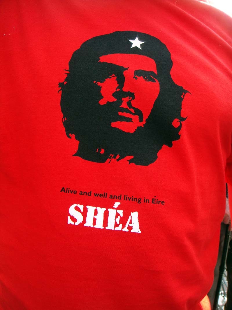Ist vielleicht auch Gott ein Ire? Trendige T-Shirt-Träger greifen die Wurzelsuche jedenfalls mit Humor auf und gemeinden einen Halbgott der Linken in Irland ein: „Shéa Guevara“ – er lebt, es geht ihm gut und er lebt natürlich in Irland.