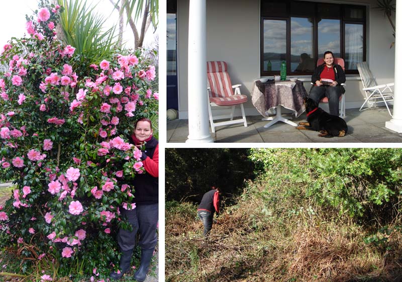 Die sonnigen Stunden der letzten zehn Tage verbrachten wir vor allem jätend, gefühlte 50 Kilometer größtenteils vertrocknete Brombeer-Ranken haben wir im weitläufigen Park hinter unserem Gäste- und Seminarhaus bereits mit Rosenscheren klein geschnitten und zertreten. Dahinter/darunter konnten wir etliche „neue“ Pflanzen entdecken. Die Päuschen zwischendrin werden natürlich faulenzend auf der Veranda verbracht, ein wunderbares Touristenfeeling! Auf dem Bild bin nicht ich zu sehen, sondern „meine externe Festplatte“, unsere Assistentin und Organisationstalent. | Those many sunny days we spent weeding miles and miles of brambles, the breaks we spent on the sunny verandah of our guest house.