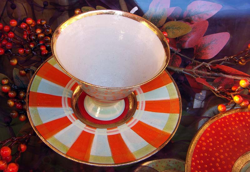Die wunderschönen Tassen passen zwar farblich gut dazu, sind jedoch so wunderschöne Kunstwerke, dass ich sie nicht zum Teetrinken verwenden würde (und darum erst gar nicht kaufe). | Those extremely gorgeous cups are real art and much too pretty to be used for drinking tea or coffee out of them (so I didn’t buy one).