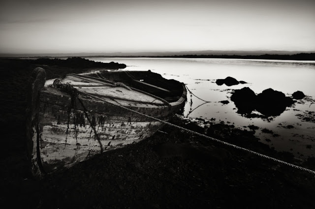 | Das alte Boot vor der Haustür in Kinvara – in schwarz-weiß. |