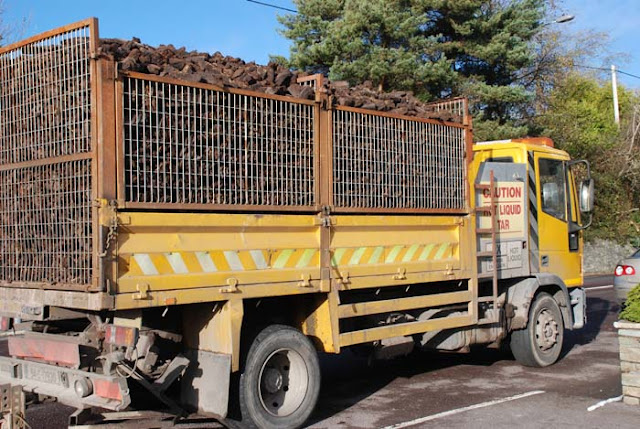 Der Schuldirektor wird indes nicht müde, einen weiteren schulfreien Tag auf dem elterlichen Handy anzukündigen, wenigstens die Jugend freut sich. Unsere steile Straße mit dunkel-eisigen Kurven jedenfalls fährt sich bestens, vor allem durch die perfektionistischen Streumaßnahmen des Nachbarfarmers. Ihm wie auch anderen Farmern wird das Streumaterial zur Verfügung gestellt, bei der Arbeit handele es sich um „voluntary work“ (freiwillige Arbeit), wie er mir versicherte. Die Peat- und Kohlehändler und fast alle Tankstellen dürften sich derzeit eine goldene Nase am Brennmaterial verdienen, so hat ein Berufsstand in diesen schweren Zeiten wenigstens ein gutes Weihnachtsgeld zur Verfügung. Mit diesen Torfbarren und -klumpen (peat) wird noch in vielen alten Häusern geheizt, man kann es gut bis auf die Straße riechen.