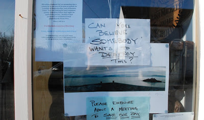 Im Schaufenster von Frank O´Mahony´s Laden in Kilcrohane fragt ein Photo vom Dooneen Pier unschuldig: „Kannst Du glauben, dass jemand das hier zerstören will?“ und ruft die Menschen der Region dazu auf, die Versammlung am kommenden Freitagabend in der Gemeindehalle von Kilcrohane zu besuchen, um „unsere Bucht zu retten“.