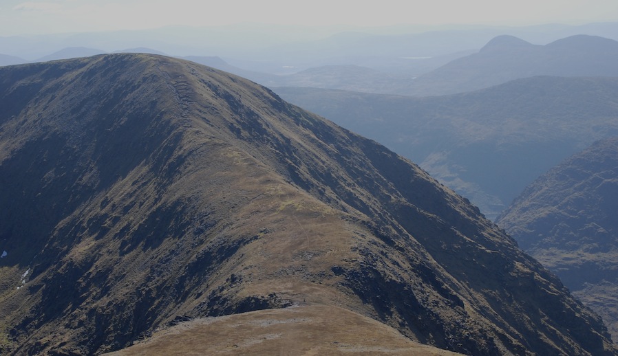 Auf schmalem Grat: Der Wanderer war heute auf dem Dach Irlands unterwegs. Deshalb nur eine kurze Nachricht. Es heißt, dass man im Gebirge der MacGillycuddy’s Reeks maximal 30 bis 40 schöne Tage pro Jahr mit freier Sicht erwarten kann. Heute war sicher einer davon. Fotos von der Teufelsleiter und von Irlands höchstem Berg „Carrauntoohil“ gibt es morgen hier im Irland Blog. Das Foto zeigt den Col, die Traverse vom „Corran Tuathail“ zum Cnoc na Tuinne. Es ist ein großes Erlebnis, diesen Grat entlang zu laufen.