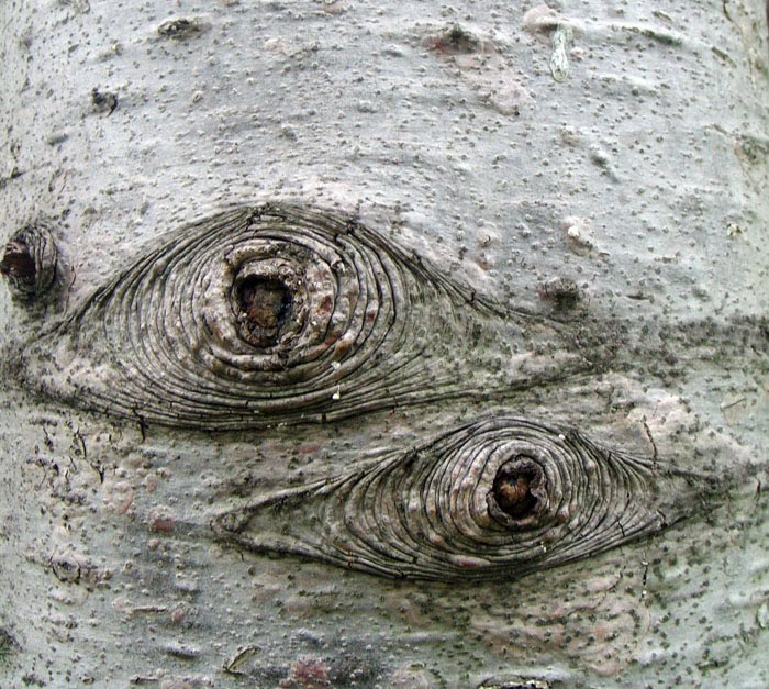 Wer schaut uns denn auf die Finger? Es ist die Rinde einer Abies concolor, einer seltenen Tannenart. | Who is watching us? It is the bark of Abies concolor, a Californian pine species.