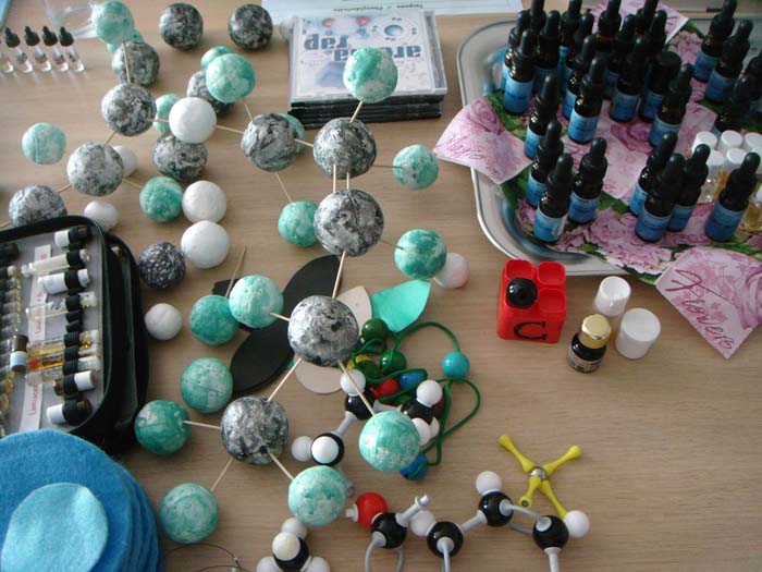 Mein Arbeitsfeld für das Wochenende: Duft-Chemie rückwärts und vorwärts, oben und unten. Zum Hören. zum Sehen, zum Riechen, zum Fühlen. | O dear, that’s how my desk looked while I taught fragrant chemistry. Molecules to see, to touch, to smell, to hear (my humble fragrant rap).